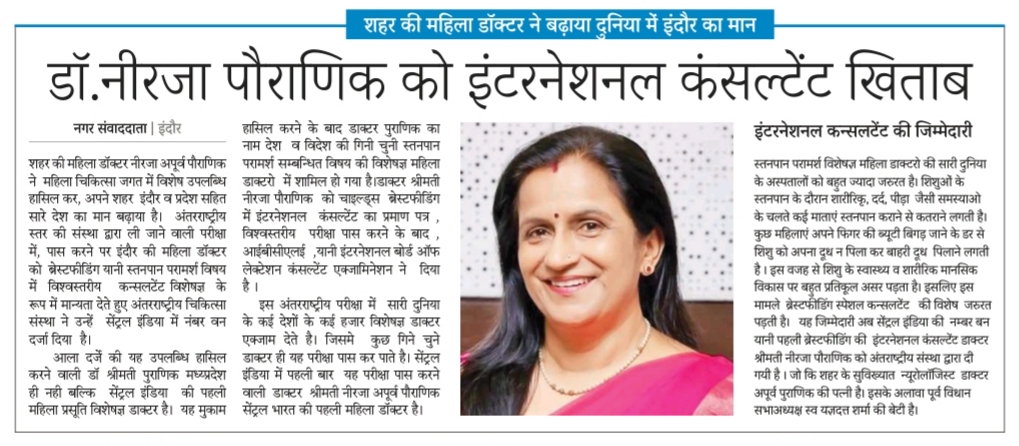 Dr Neerja Pauranik has a unique distinction of being one of the few LACTATION CONSULTANTS in Central India. She is passionate in helping mothers having any problems with Breastfeeding and advocating optimum Breastfeeding for last 25 years.